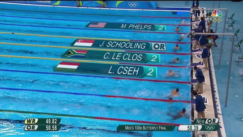 Erkekler 100 metre kelebekte Singapurlu Joseph Schooling 50.39’luk derecesiyle olimpiyat rekoru kırarak altın madalyanın sahibi oldu. Bir önceki rekorun sahibi Michael Phelps ikinci sırayı Chad Le Clos ve Laszlo Cseh paylaşınca kürsüde bir altın, üç gümüş madalyalı sporcu yer aldı.