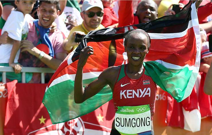Olimpik maratonu kazanan Kenyalı ilk kadın atlet olarak Jemima Sumgong zaferini kutluyor.