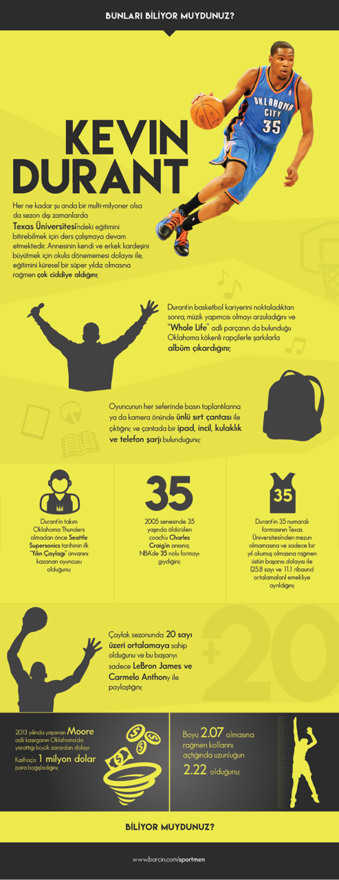 7 kez NBA All-Star takımına seçilen ve bu maçlarda ortalama 30 dakika oyunda kalıp 30.6 sayı ortalama ile oynayan Durant, gerçek bir sayı makinesi. Normal NBA sezon ortalaması 27.3, Play-Off ortalamaları ise 28.9 sayı olan bu genç adam, bundan sonraki yıllarda Oklohoma City’de mi kalır yoksa şampiyonluklar yaşamak için başka bir takıma mı gider bilinmez ama NBA Şöhretler karmasına çoktan adını yazdırmışa benziyor. Yazımızı onun sözleri ile bitirelim: “Eğer yetenek çok çalışmıyorsa, çok çalışmak yeteneği alt eder.”