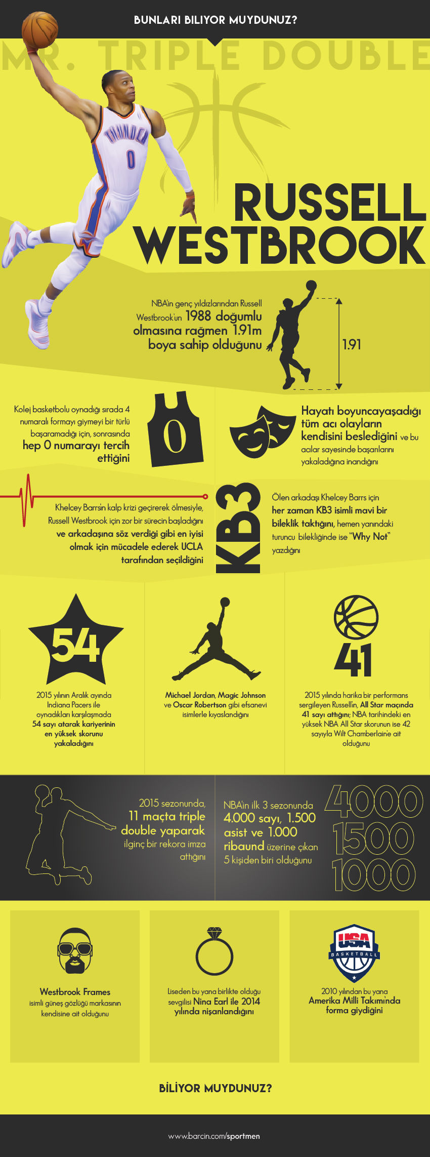 - NBA’in genç yıldızlarından Russell Westbrook’un 1988 doğumlu olmasına rağmen 1.91m boya sahip olduğunu